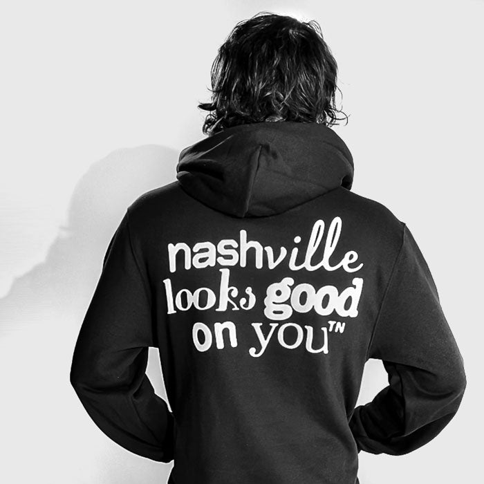 The back print says “Nashville Looks Good On You” — but here’s the twist: each word shows up in a different font, celebrating the city’s mix of accents, stories, and styles. It’s Nashville’s personality in wearable form.